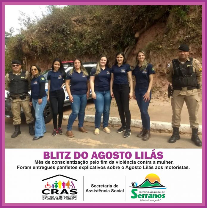 A Prefeitura Muncipal de Serranos em parceria com a Polícia Militar e o Cras, realizou hoje dia 26/08 a blitz do Agosto Lilás, mês de conscientização pelo fim da violência contra a mulher.