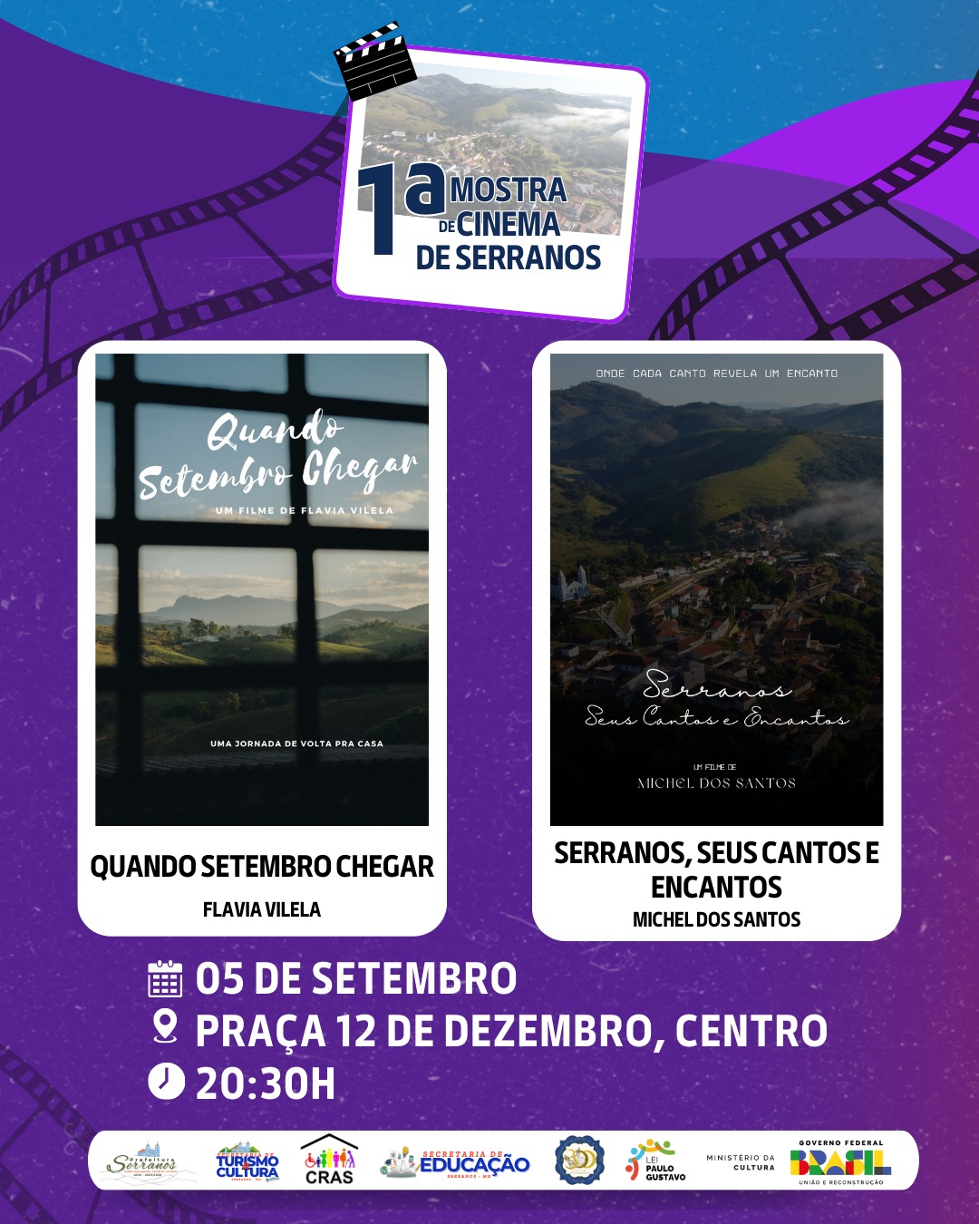 A programação começa às 20h30 com apresentação dos integrantes do projeto Tocando a Vida, um grupo de violão do Cras. Na sequência, será exibido o curta-metragem Quando Setembro Chegar, de Flávia Vilela. O grupo de capoeira Filhos do Bonfim Mestre Michael também se apresentará nesta noite antecedendo a exibição do segundo filme da mostra, Serranos, seus Cantos e Encantos, de Michel dos Santos. No encerramento, muita música com Thiago Aurélio, Lucas Carvalho e Rose Oliveira.